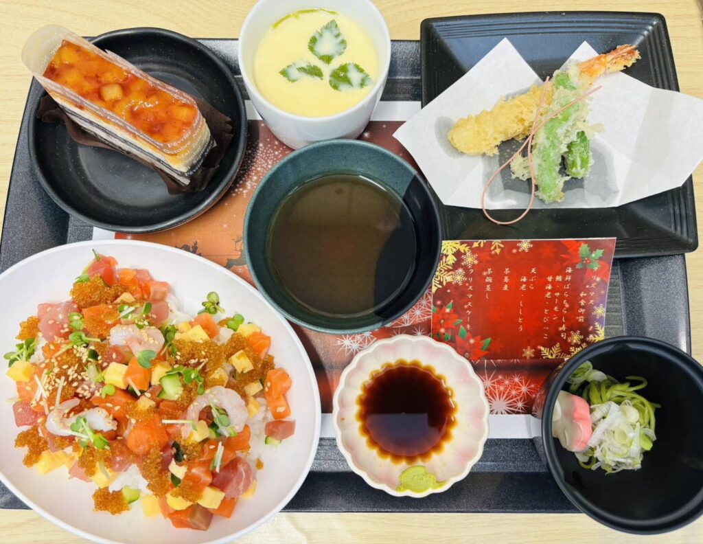 海鮮ばらちらし寿司(鮪・サーモン、甘海老、とびっこ)、天ぷら(海老、ししとう)、茶蕎麦、茶碗蒸し、クリスマスケーキ